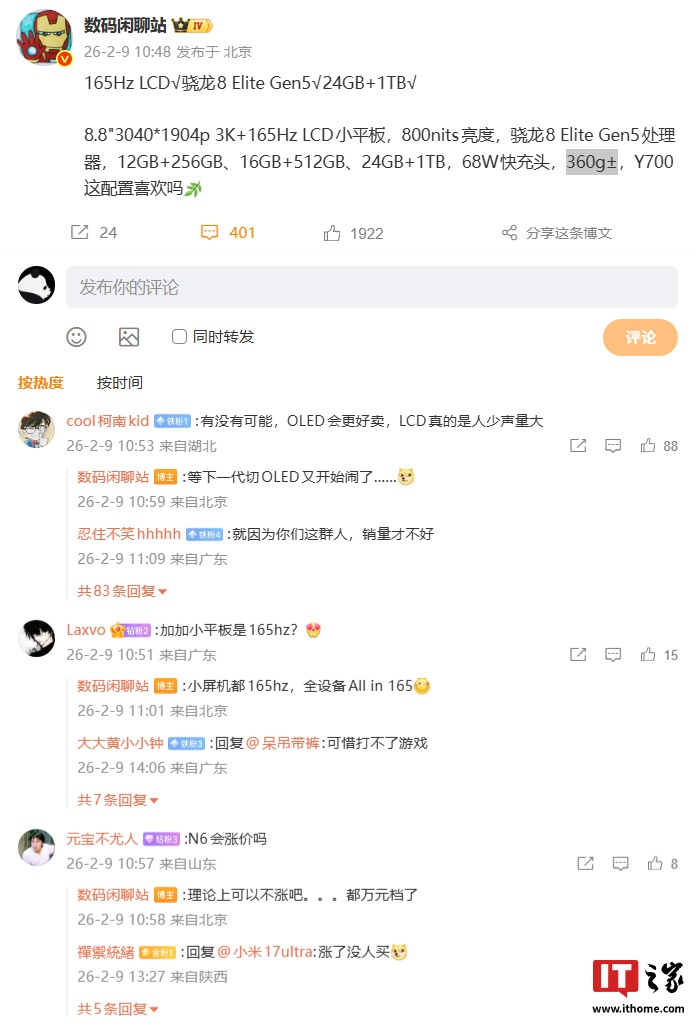 当天早些本事,联思赈济者官方公布了联思 AI 平板赈济者 Y700 的屏幕参数。据先容,新机将连续 8.8 英寸黄金尺寸筹备,并配备一块“猎速电竞屏”。